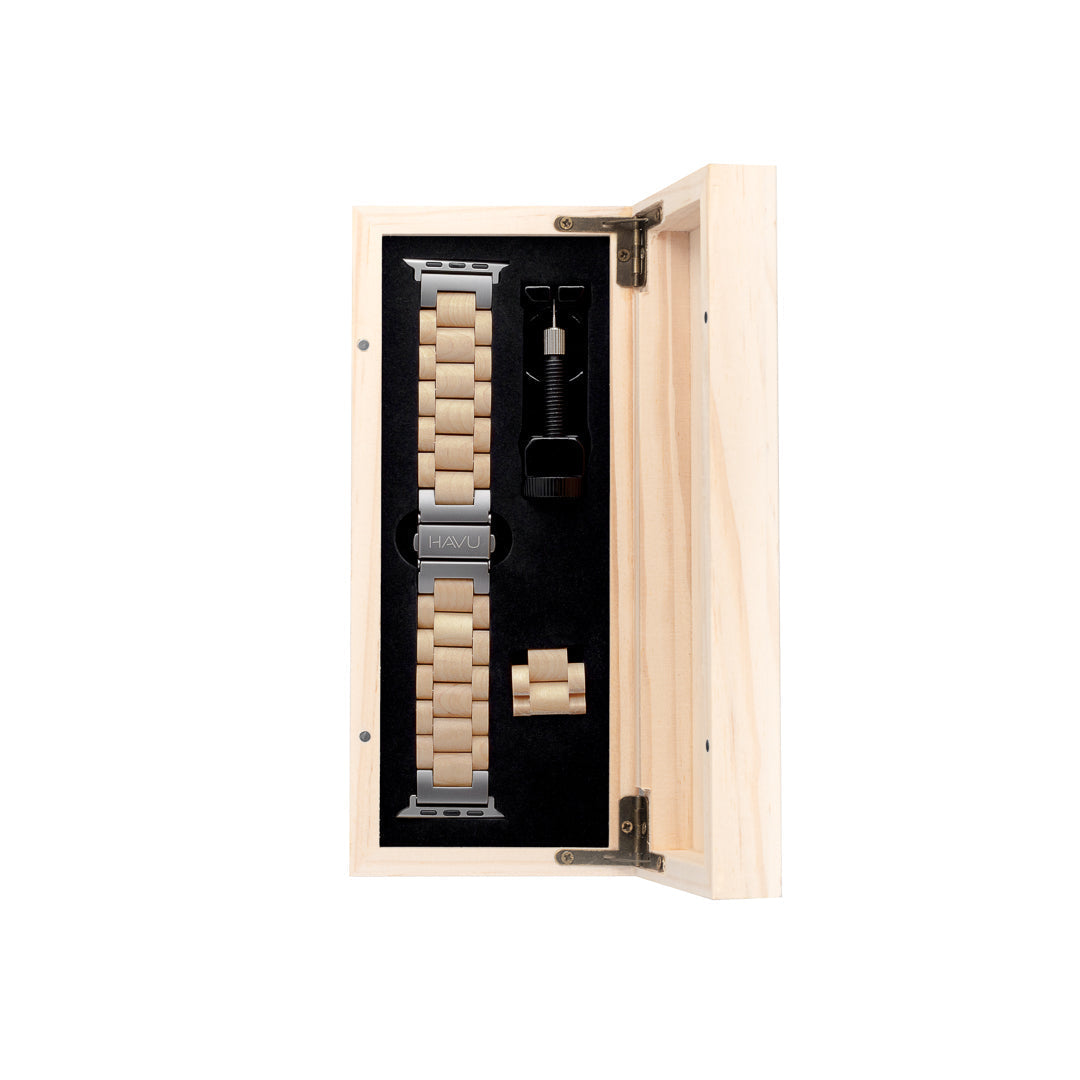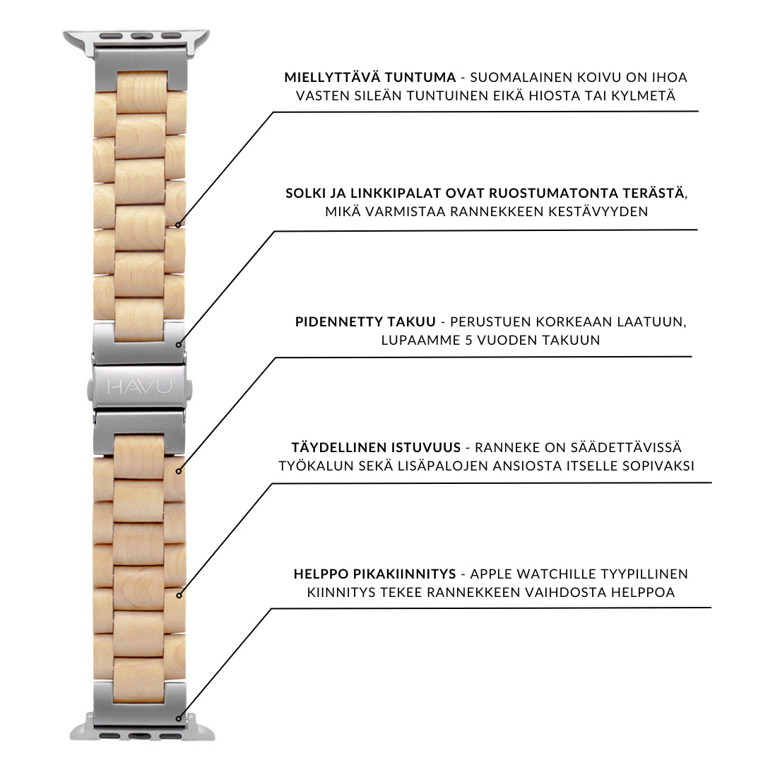 Raikasta luonnon kauneutta ja keveyttä Apple Watch Ultraasi! Suomalaisesta koivusta valmistettu Apple Watch -ranneke yhdistää modernin skandinaavisen tyylin ja huipputason kestävyyden. Vaalea, luonnollinen sävy tuo kellollesi raikkaan ja ainutlaatuisen ilmeen, ja ruostumattomasta teräksestä valmistetut metalliosat on käsitelty vastaamaan väritykseltään Apple Watch Ultran titaanirunkoa – täydellinen yhdistelmä estetiikkaa ja toimivuutta.