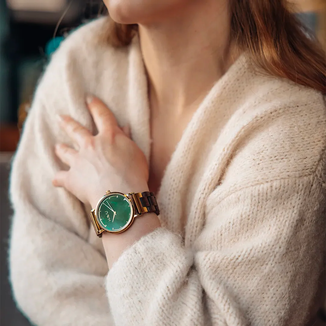 Kellotaulun ja rannekkeen lisäksi rannetta vasten nojaava tausta on puuta, jonka ansiosta kello tuntuu pehmeältä ja kevyeltä iholla. Valitsimme rannekelloon ensiluokkaiset materiaalit. Pähkinäpuu on arvostettu ja kestävä puumateriaali, jota on helppo työstää. Lisäksi se on kuvioltaan kaunis, joten se sopii kelloon erinomaisesti.