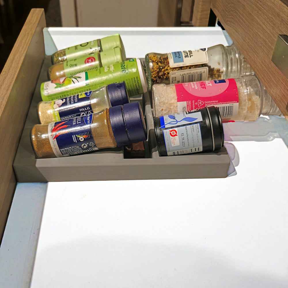 Tämä käytännöllinen ja tilaa säästävä maustepurkkiteline on suunniteltu erityisesti vetolaatikkoon. Kotimaisesta PETG-materiaalista 3D-tulostettu teline pitää 10 maustepurkkia siististi järjestyksessä ja helposti saatavilla.