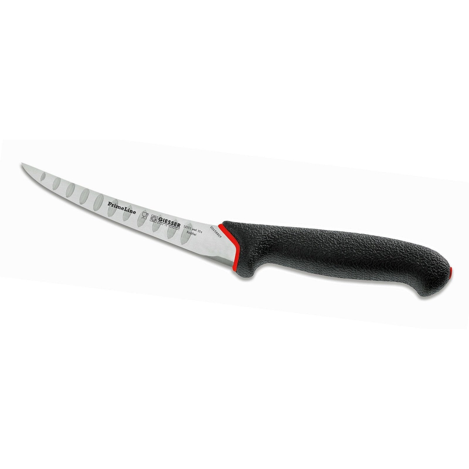 Giesser urbeningskniv med styvt, böjt, smalt och olivslipat blad. Handtagets utformning och material ger ett bra grepp t.o.m. om handen är våt eller oljig.