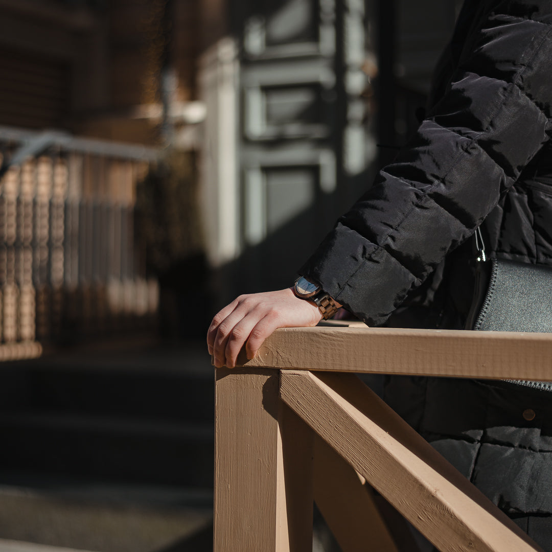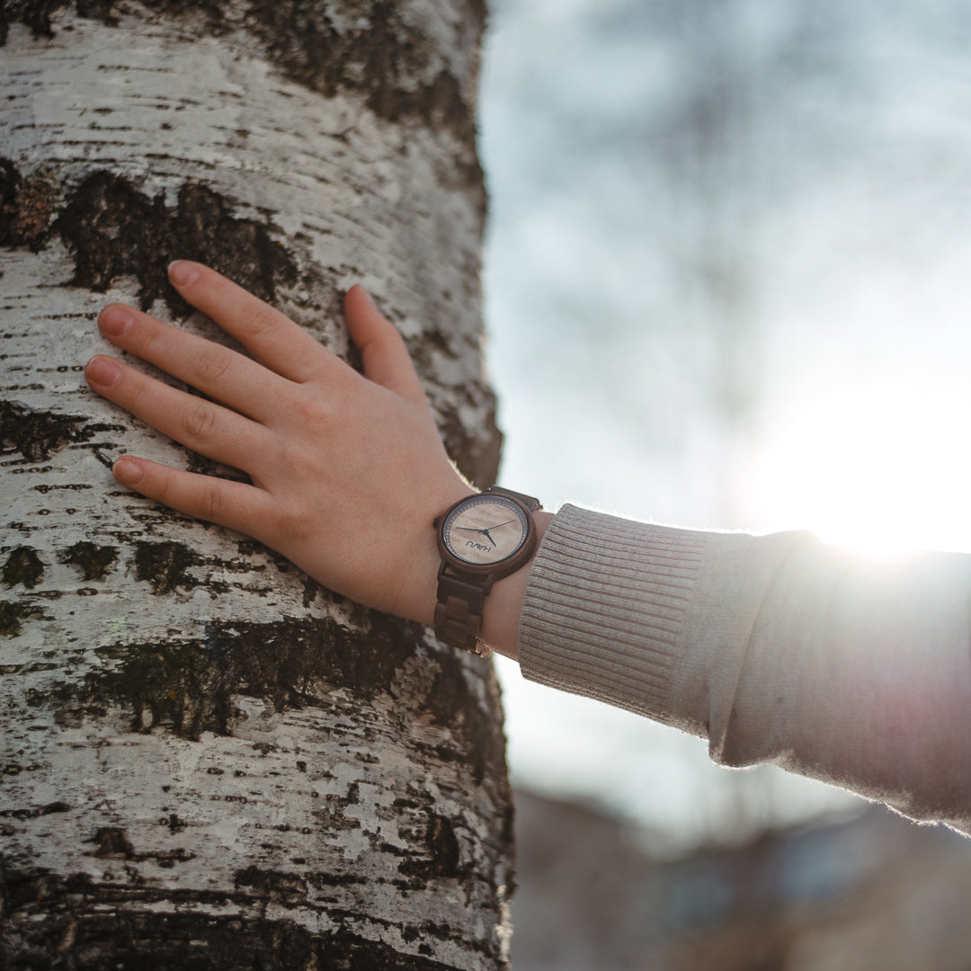 Kellotaulun ja rannekkeen lisäksi rannetta vasten nojaava tausta on puuta, mikä on valtava etu kellon käytössä, sillä puu tuntuu pehmeältä ja kevyeltä iholla. Valitsimme upeaan designiimme ensiluokkaiset materiaalit. Pähkinäpuu on arvostettu ja kestävä puumateriaali, jota on helppo työstää, minkä lisäksi se on kuvioltaan kaunis - siispä se sopii kelloon erinomaisesti. Aavassa on laadukas sveitsiläinen Ronda 763 -kvartsikoneisto, jossa on erittäin tarkka käynti. Rannekkeen ensimmäiset palat ovat metallia, joten Aava kestää erinomaisesti jokapäiväistä käyttöä.