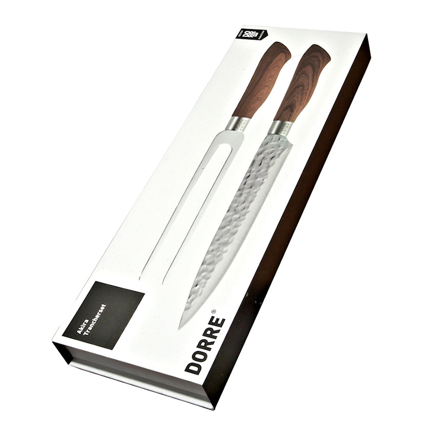 Det högkvalitativa Akira steksetet är speciellt utformat för snygg skivning av stek. I setet ingår en stekgaffel och en kniv, med vilka du kan skära perfekta skivor från steken. Handtag i imiterad trä ger ett stadigt grepp och smidda stålblad säkerställer exakta skärresultat. Detta klassiska stekset är ett oersättligt verktyg både vid festbordet och i vardagsmatlagningen.
