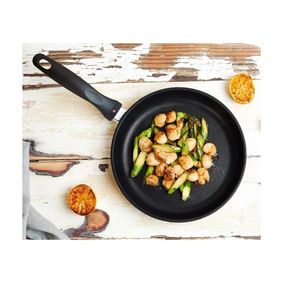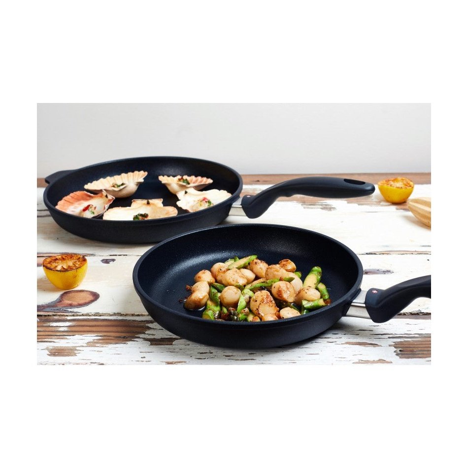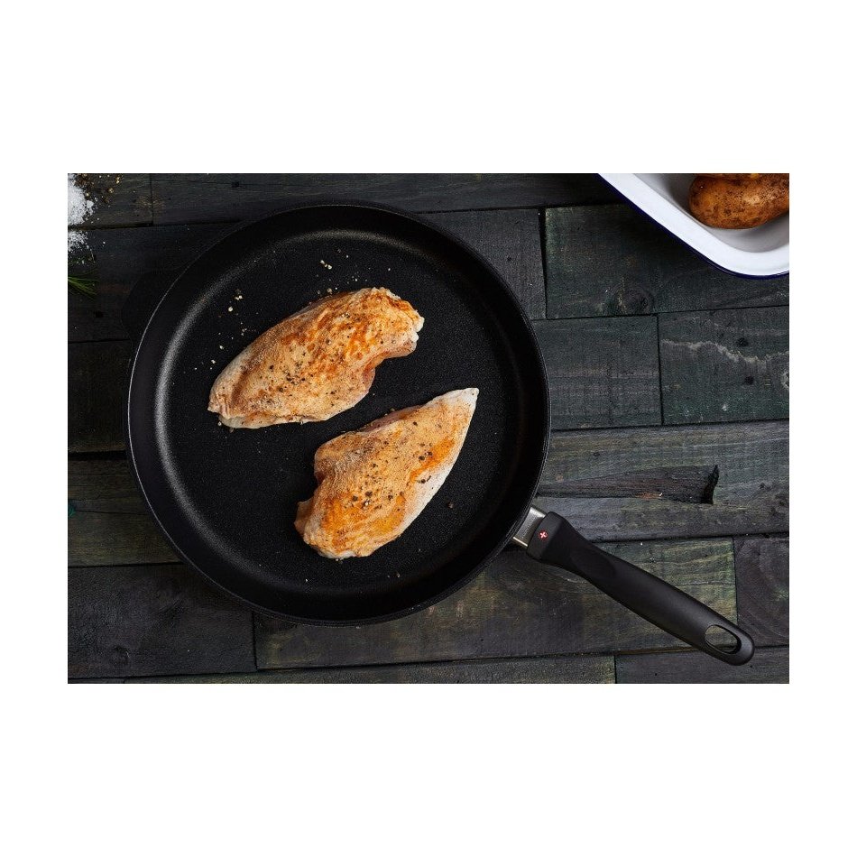 Stekpannan fungerar på alla hällar och handtaget i bakelit är ugnssäkrat för temperaturer ända upp till 260 °C.