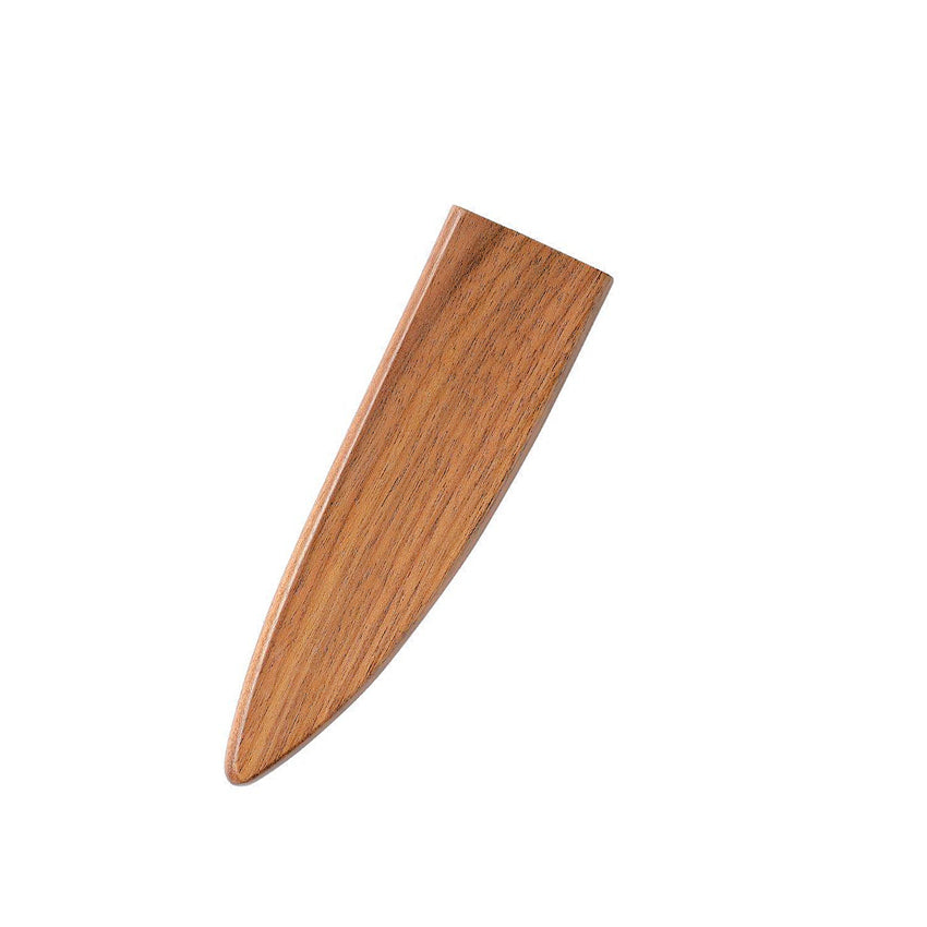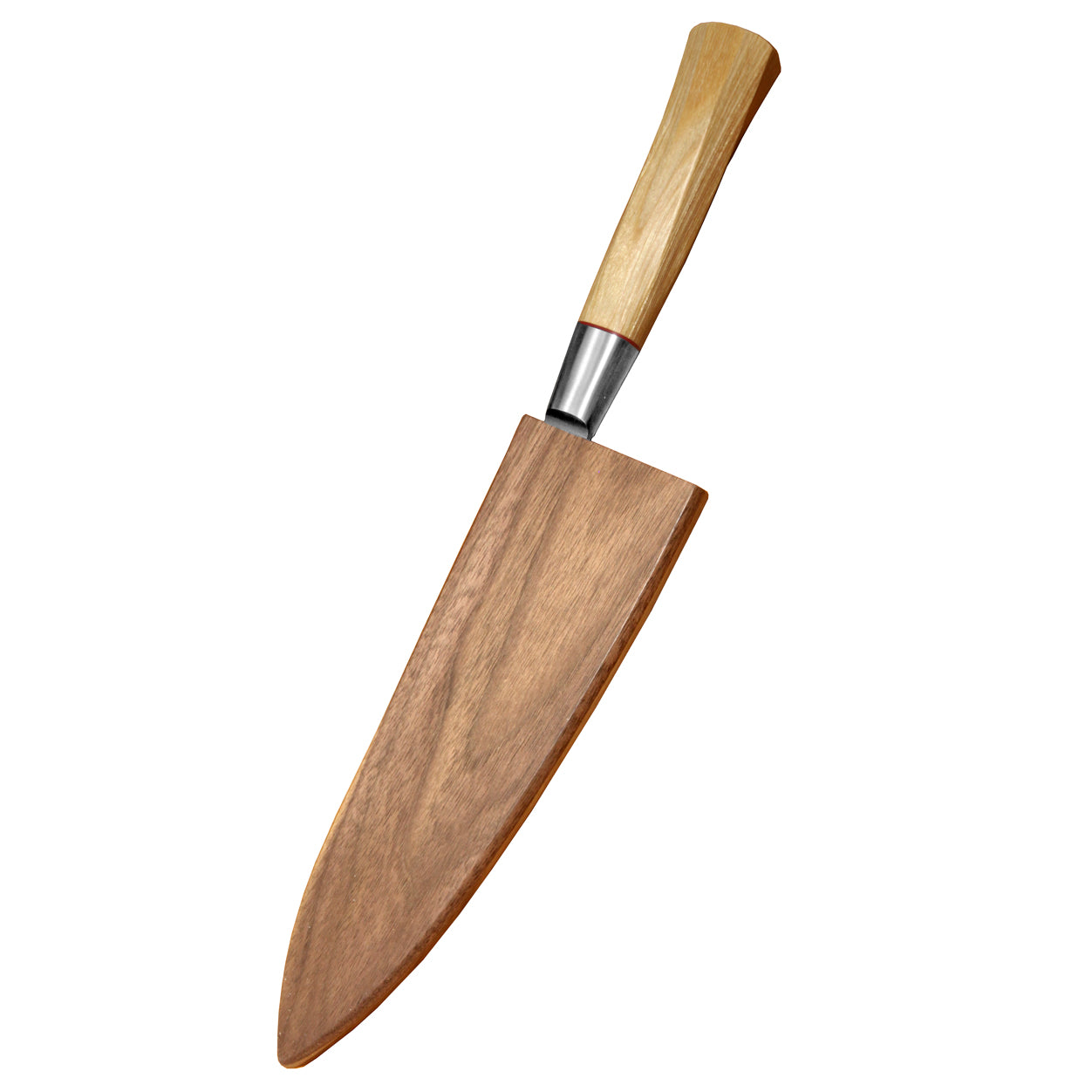 Pähkinäpuusta valmistettu teräsuoja kokkiveitselle: teräpituus enintäin 21 cm ja terän  suurin leveys alle 4,8 cm  Suojassa on magneetti joka pitää suojan paikoillaan. Sopii yleisimmille veitsille, mm.  Suncraft ja Yaxell veitsille.