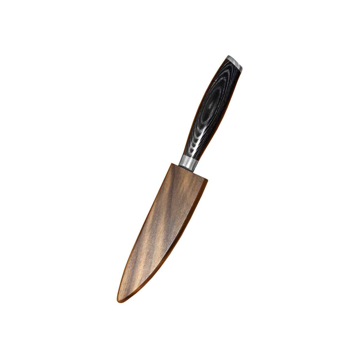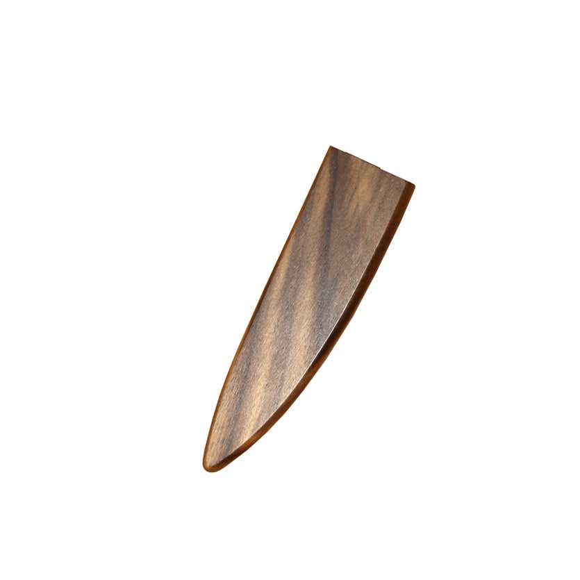 Pähkinäpuusta valmistettu teräsuoja santoluveitselle, terän pituus enintäin 13 cm ja suurin leveys enintäin 2,8 cm. Suojan magneetti pitää suojan paikoillaan. Sopii useimmille Santokuveitsille, mm. Suncraft ja Yaxell veitsille.